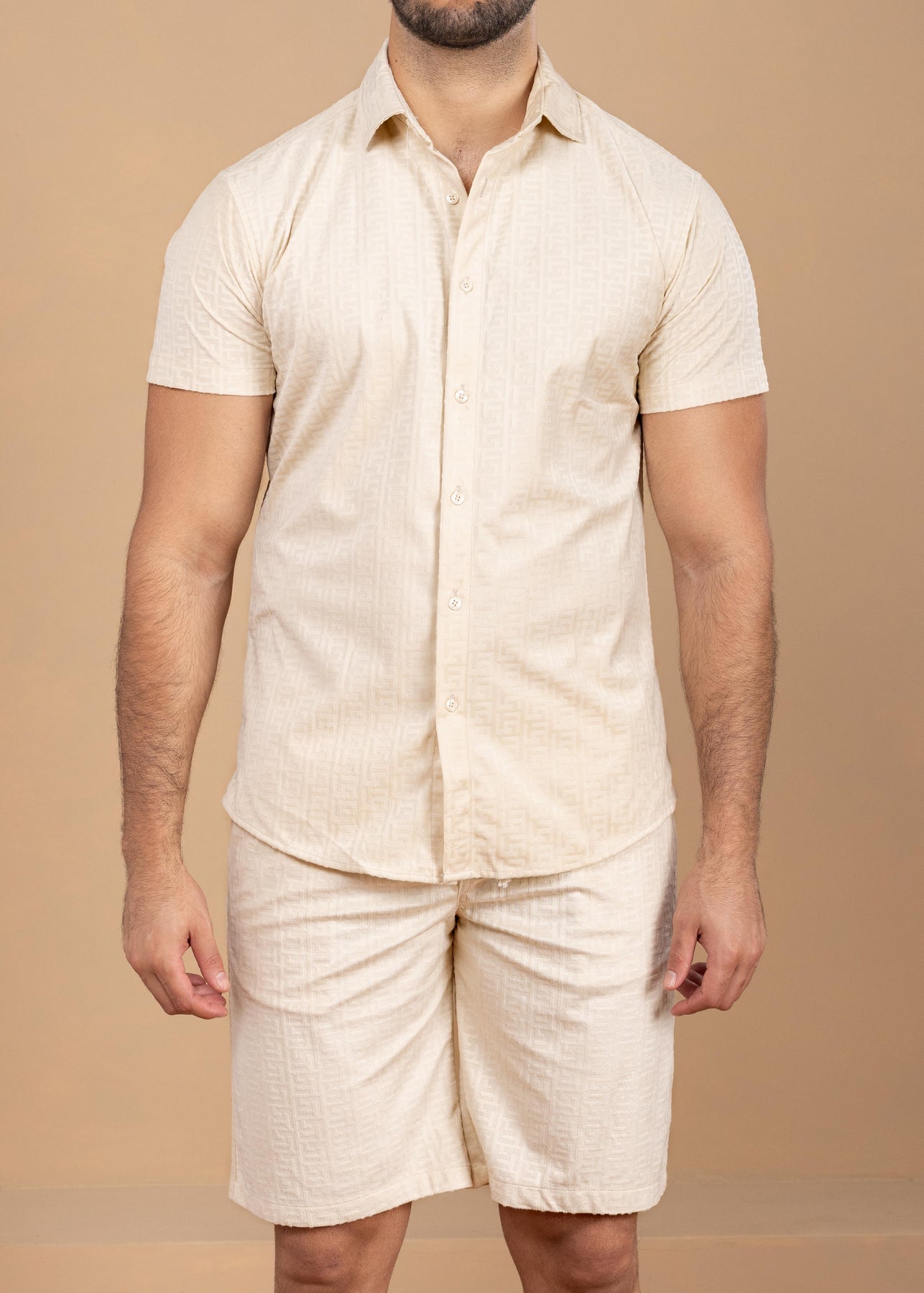 Stay effortlessly sharp with our Men’s Textured Jacquard Set in beige, featuring a short sleeve button-up shirt and matching drawstring shorts. Woven with a subtle jacquard geometric pattern, this coordinated set delivers elevated style and all-day comfort—ideal for summer days, vacations, or weekend getaways.