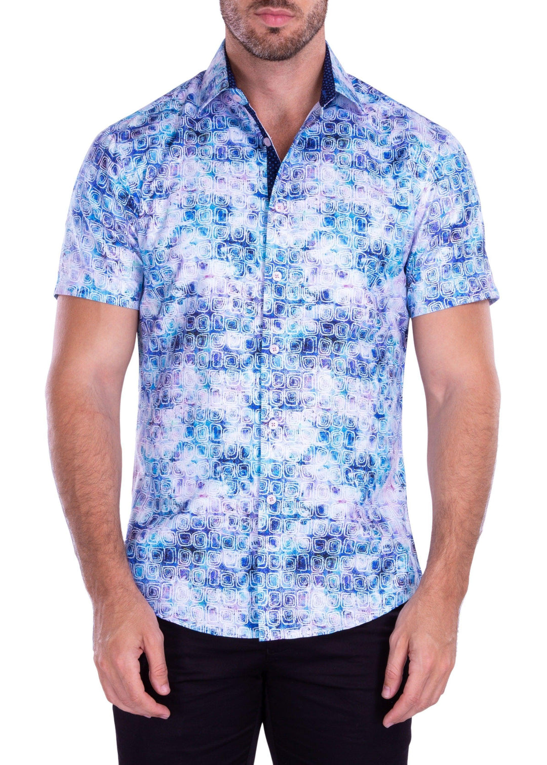 Abstract Geometric Gradient Print Blue Button Up Short Sleeve Dress Shirt