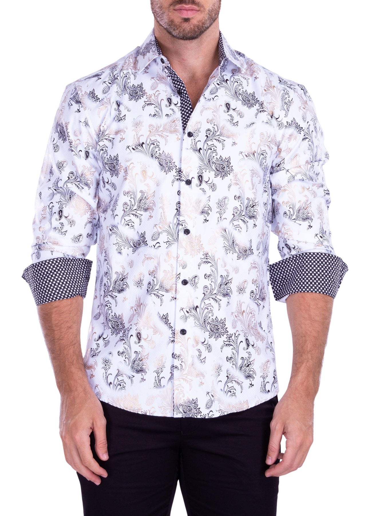 Metallic Flourish Accent On Microprint Long Sleeve Dress Shirt Royal
