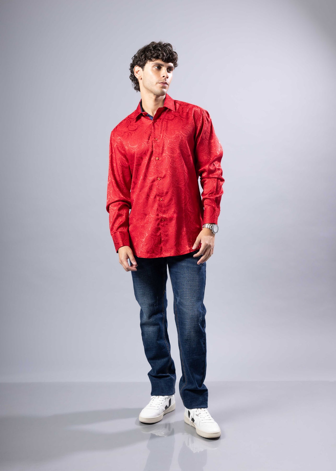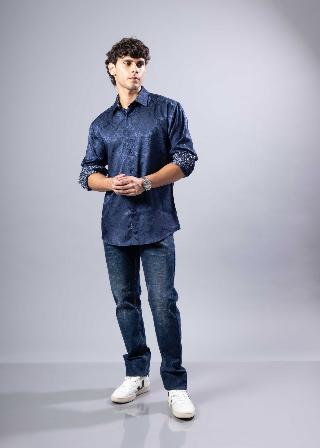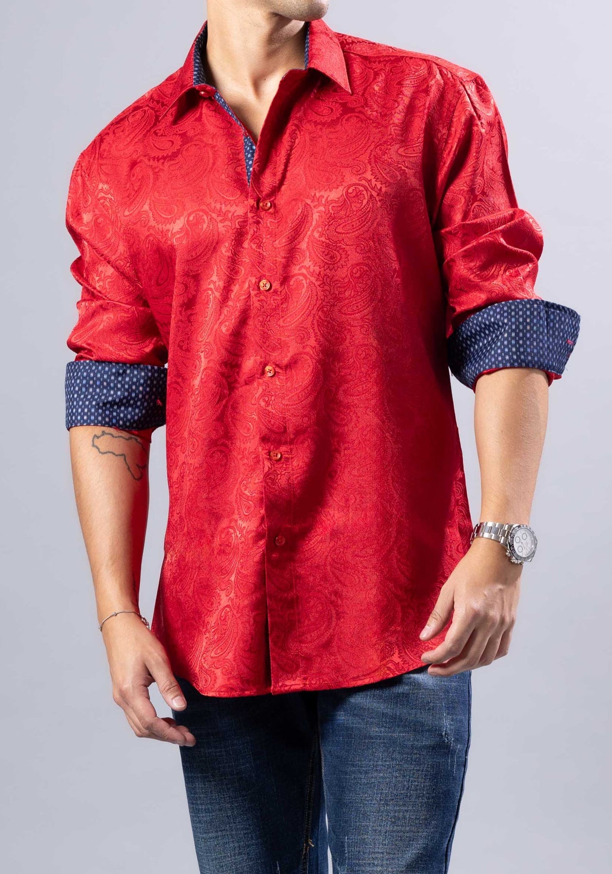 Make a bold impression in the Bespoke Moda Jacquard Shirt — where timeless elegance meets modern edge. This long sleeve button-up features a luxurious tonal paisley jacquard pattern that subtly catches the light, elevating any outfit with rich texture and style.