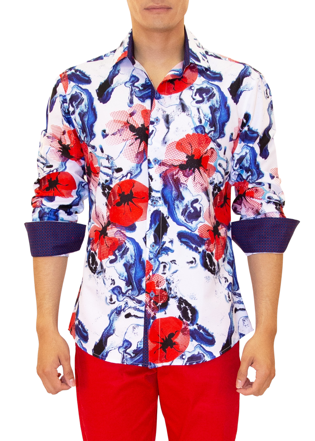 Abstract Floral Print Long Sleeve Dress Shirt Blue