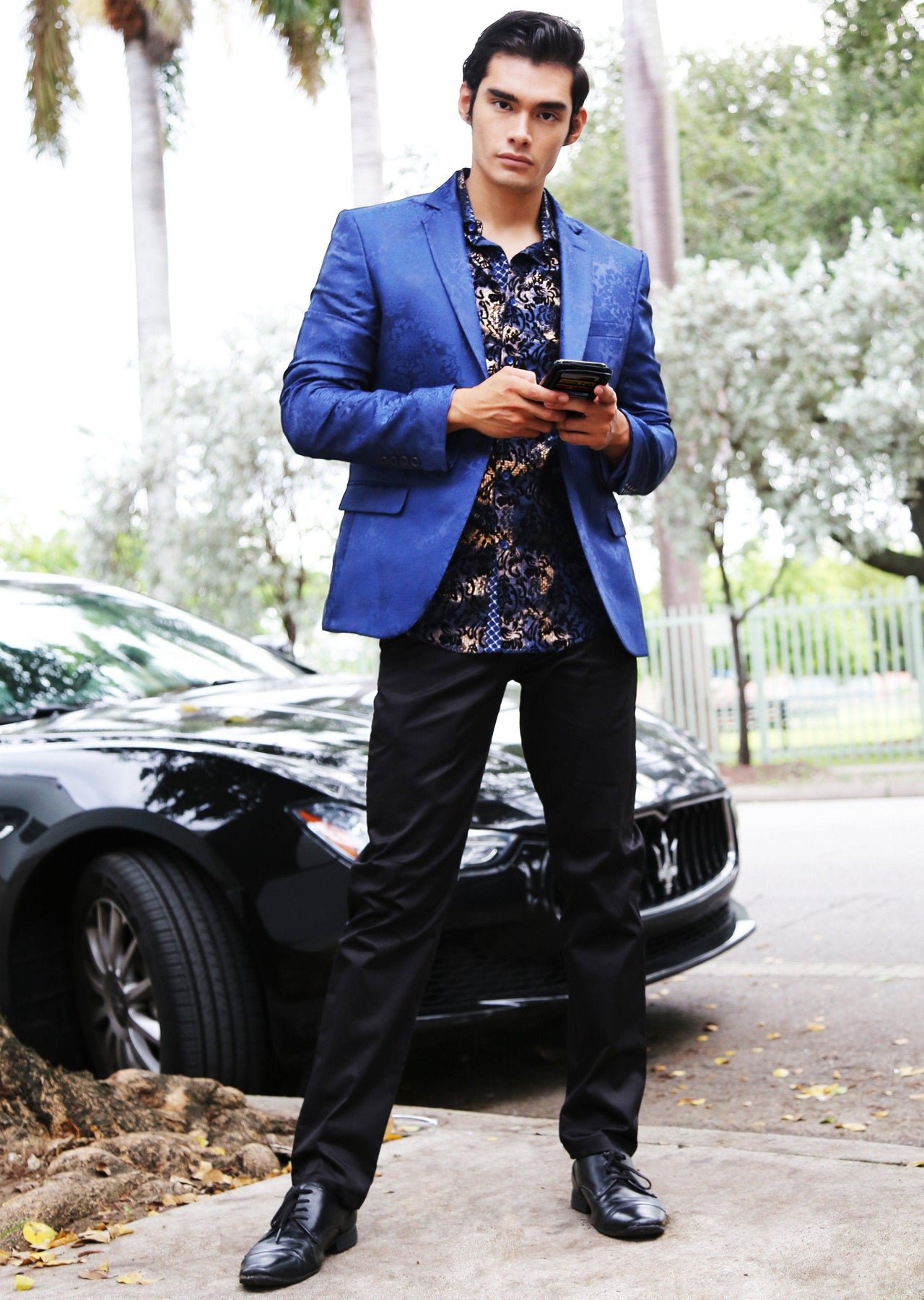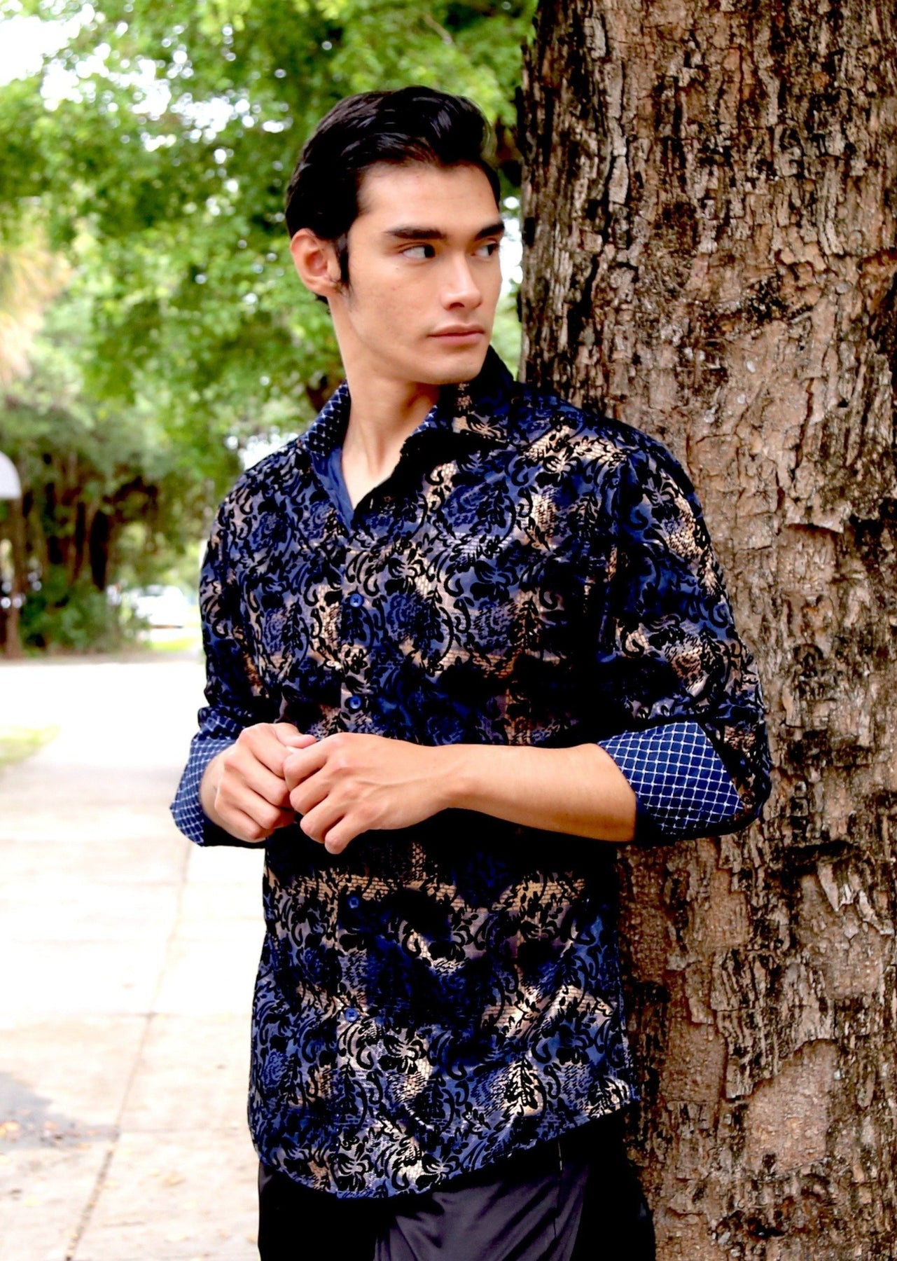 Velvet Paisley Metallic Plaid Long Sleeve Dress Shirt Navy