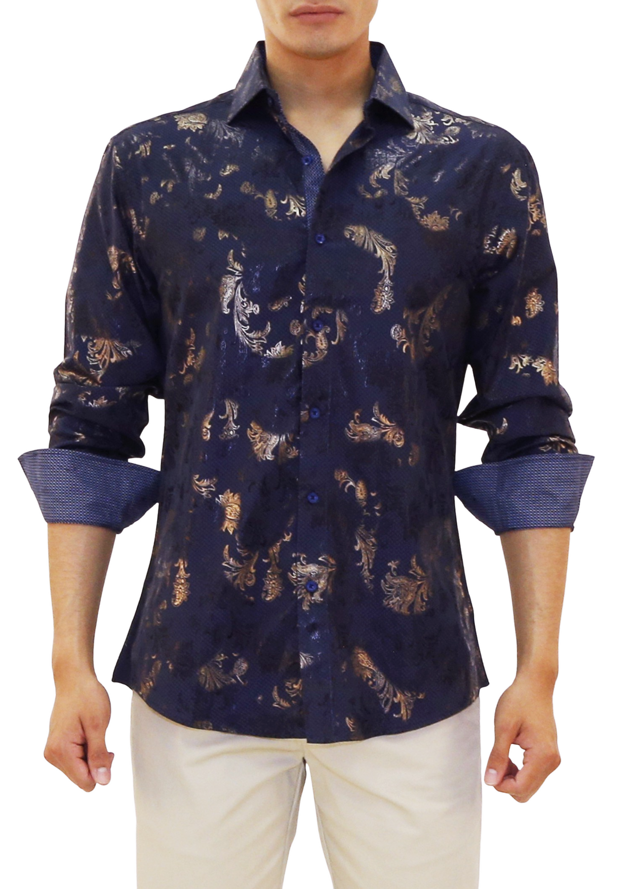 Metallic Paisley Print Long Sleeve Dress Shirt Navy