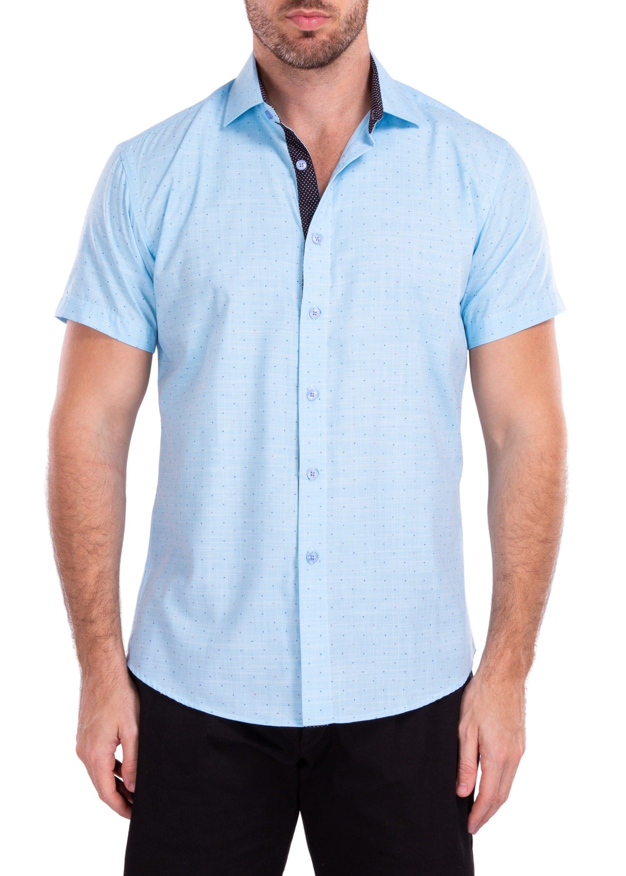 Stitched Linen Texture Solid Blue Button Up Short Sleeve Dress Shirt
