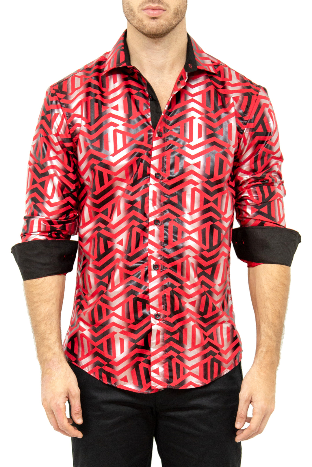 Red Geo Print Button Up Long Sleeve Dress Shirt