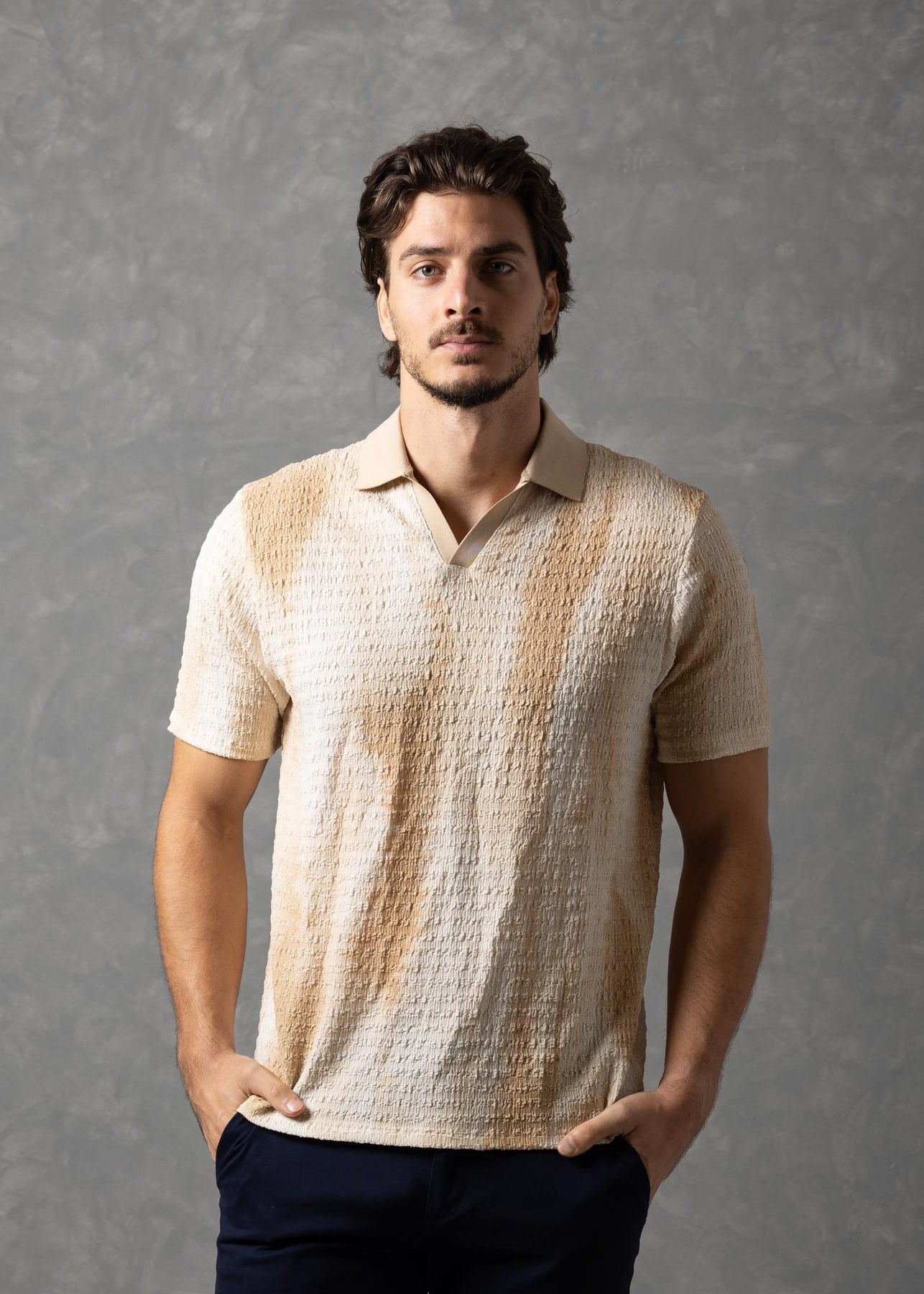 Perfect for resort wear, vacations, summer outings, and casual weekend looks, the Beige Crinkle Texture Polo Shirt delivers understated sophistication with everyday comfort.