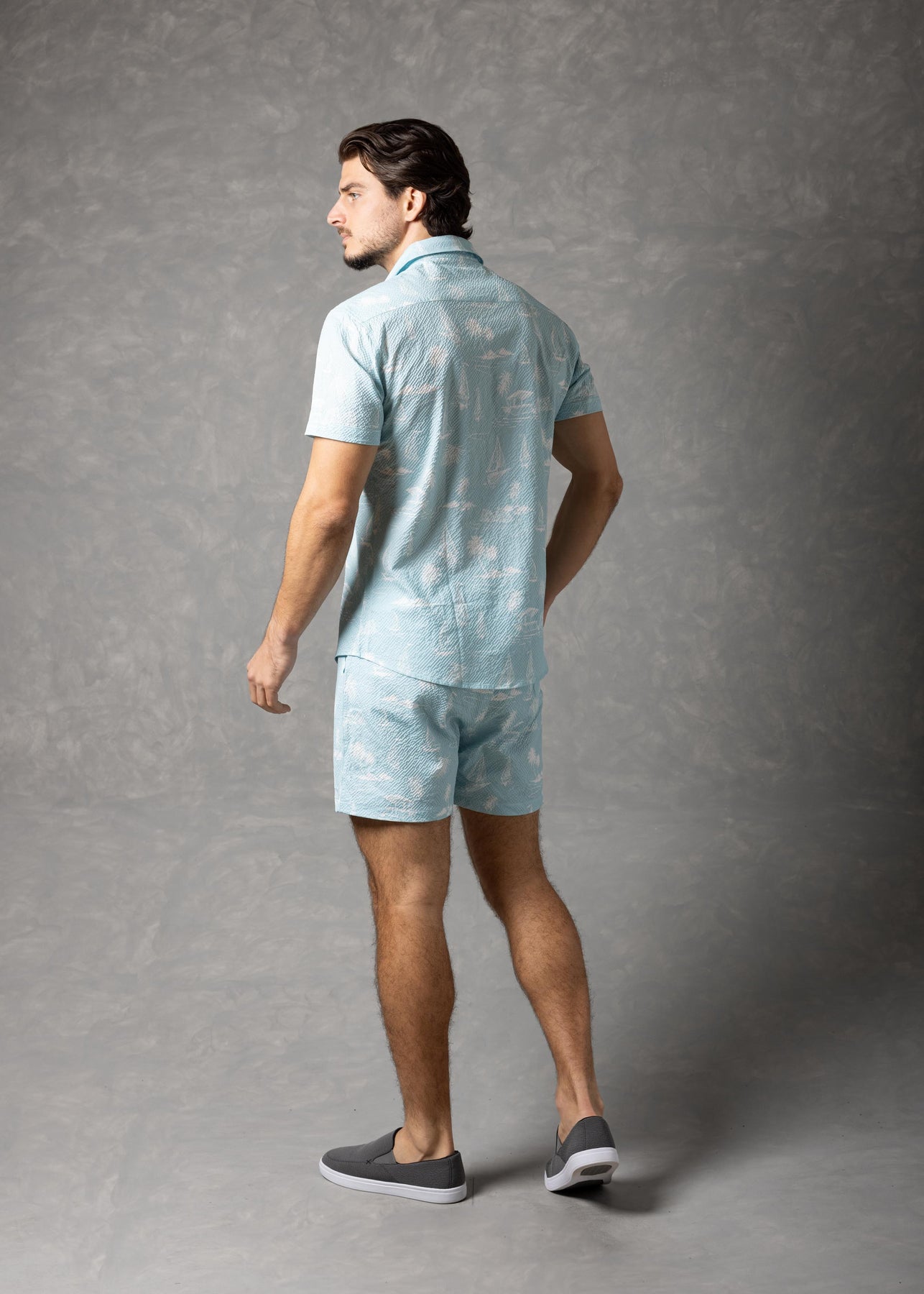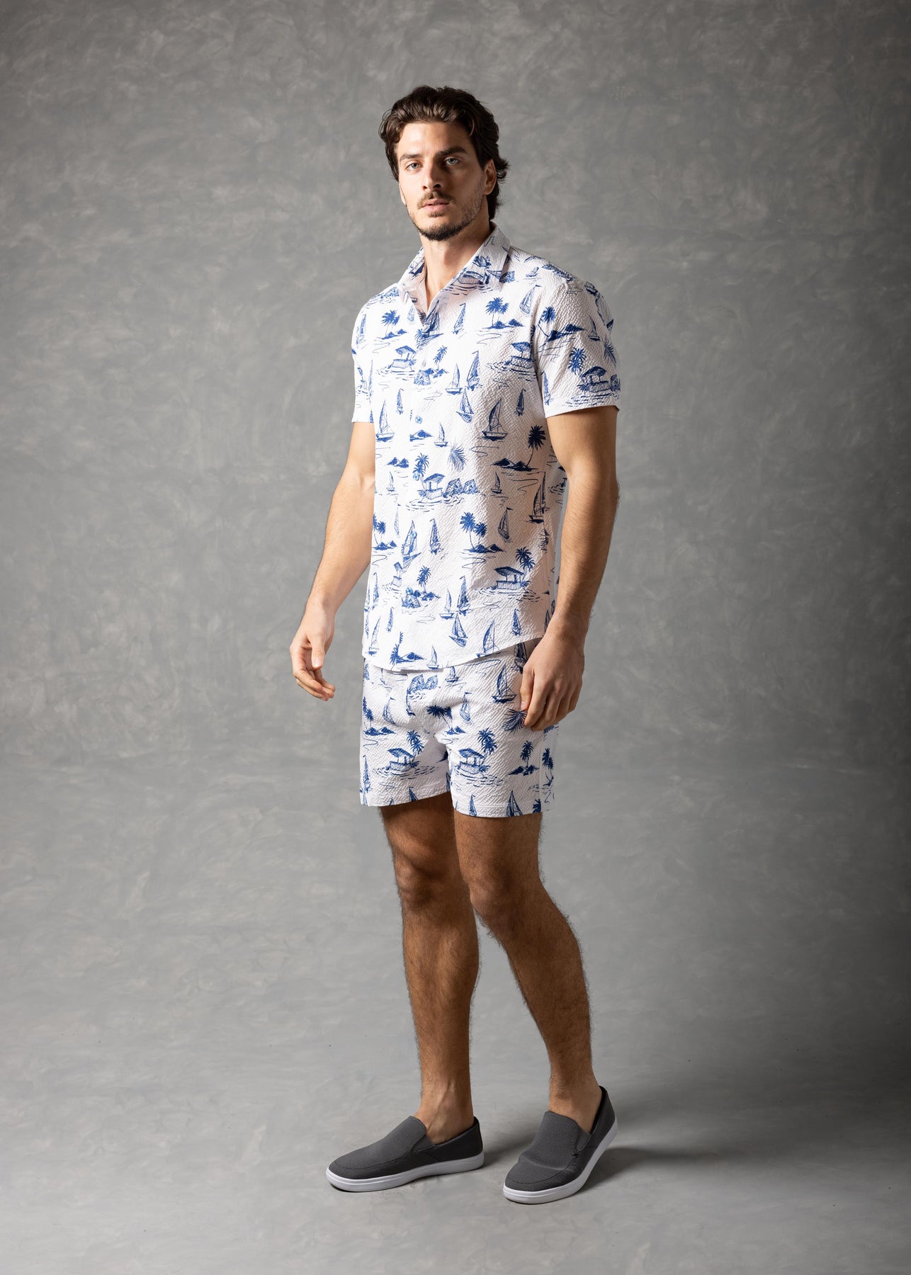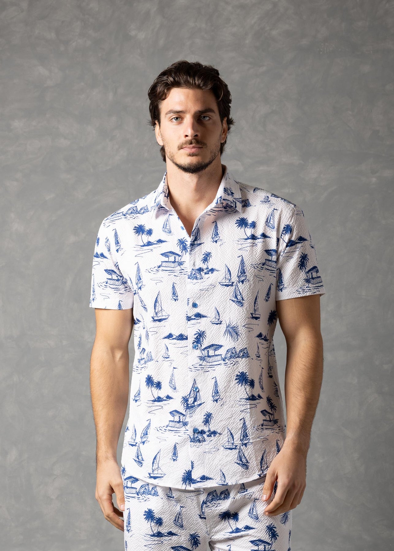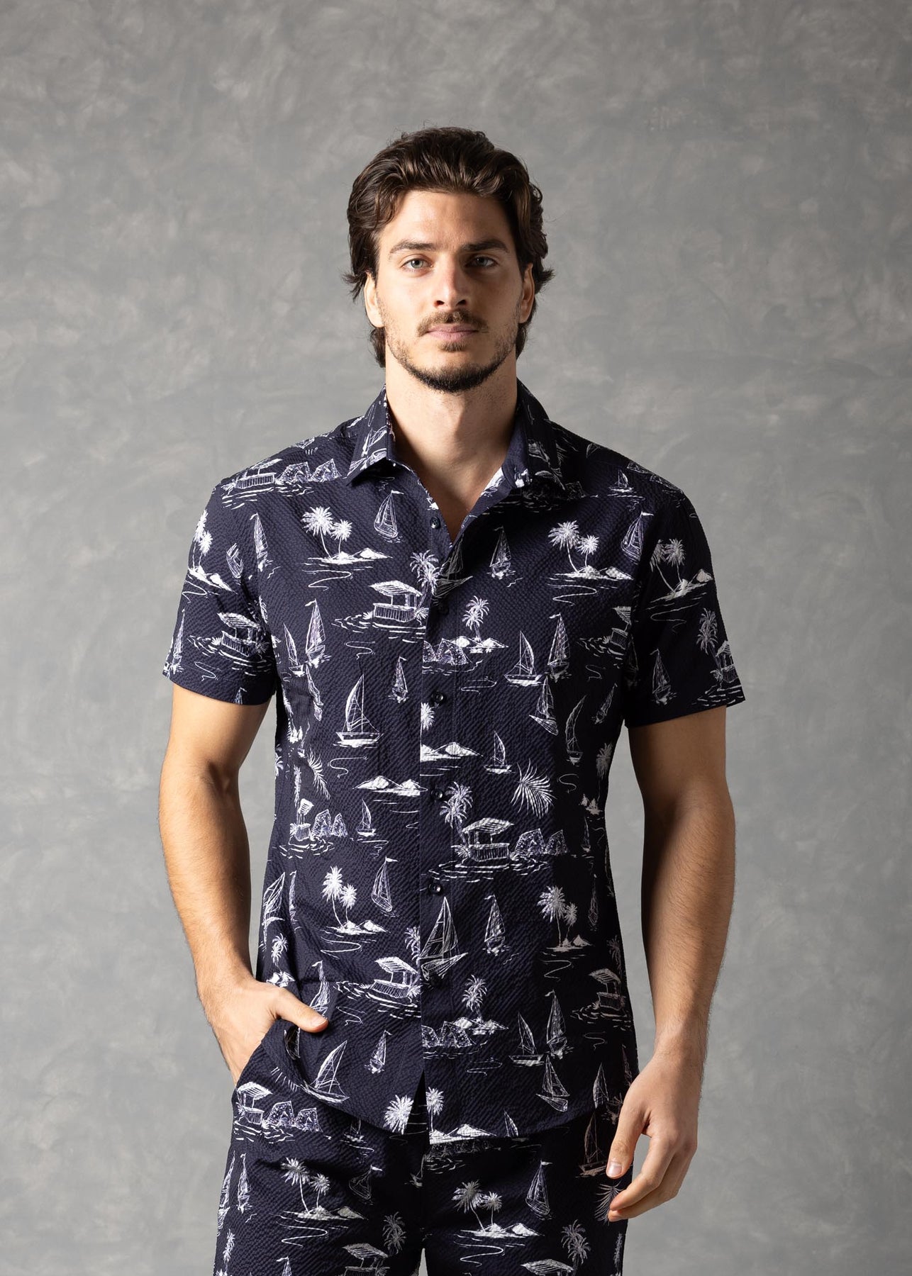 Jet Setting Shirt – Island Print Popcorn Textured Short Sleeve Button-Up