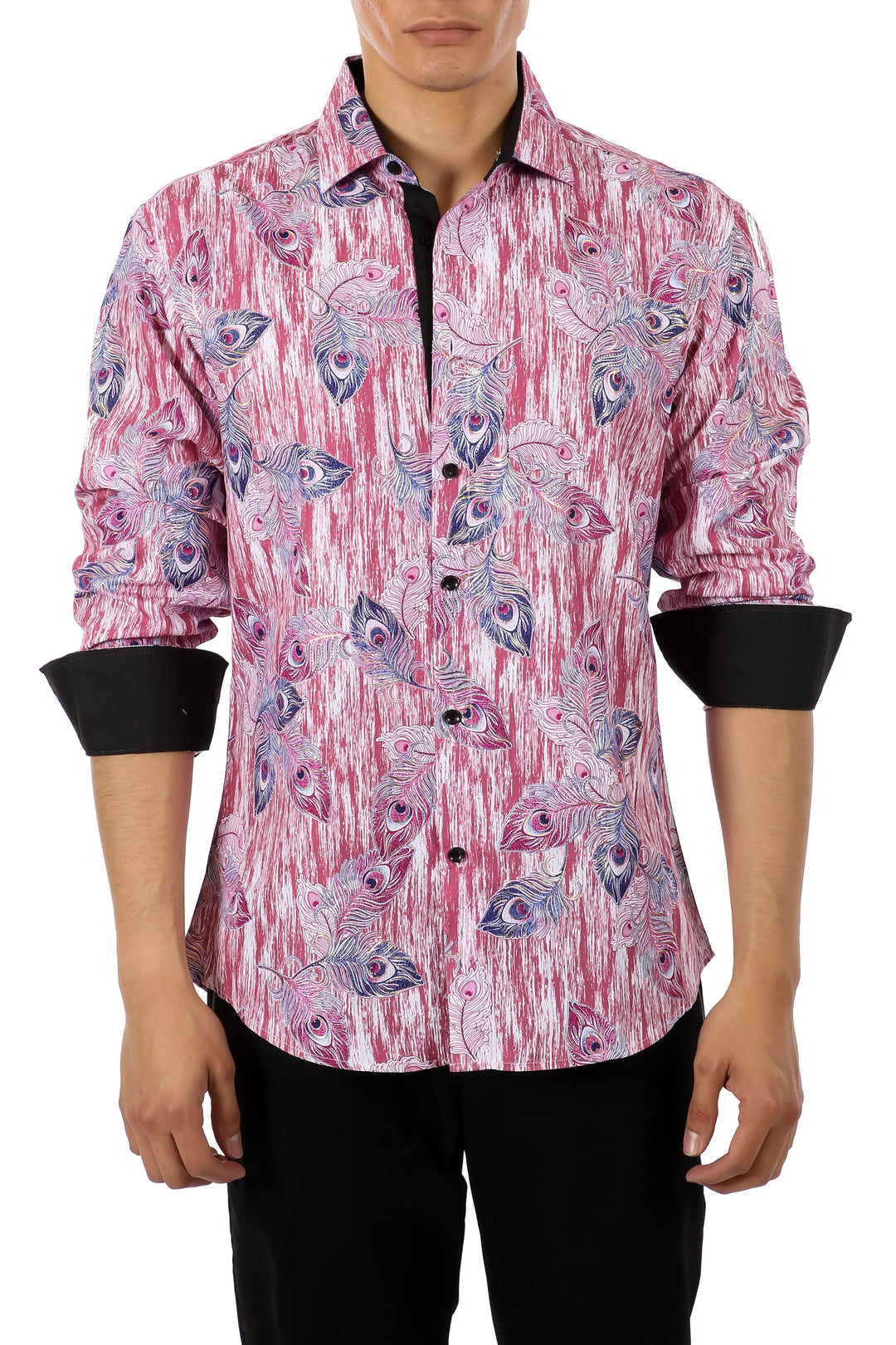Peacock Feathers Print Long Sleeve Dress Shirt Red