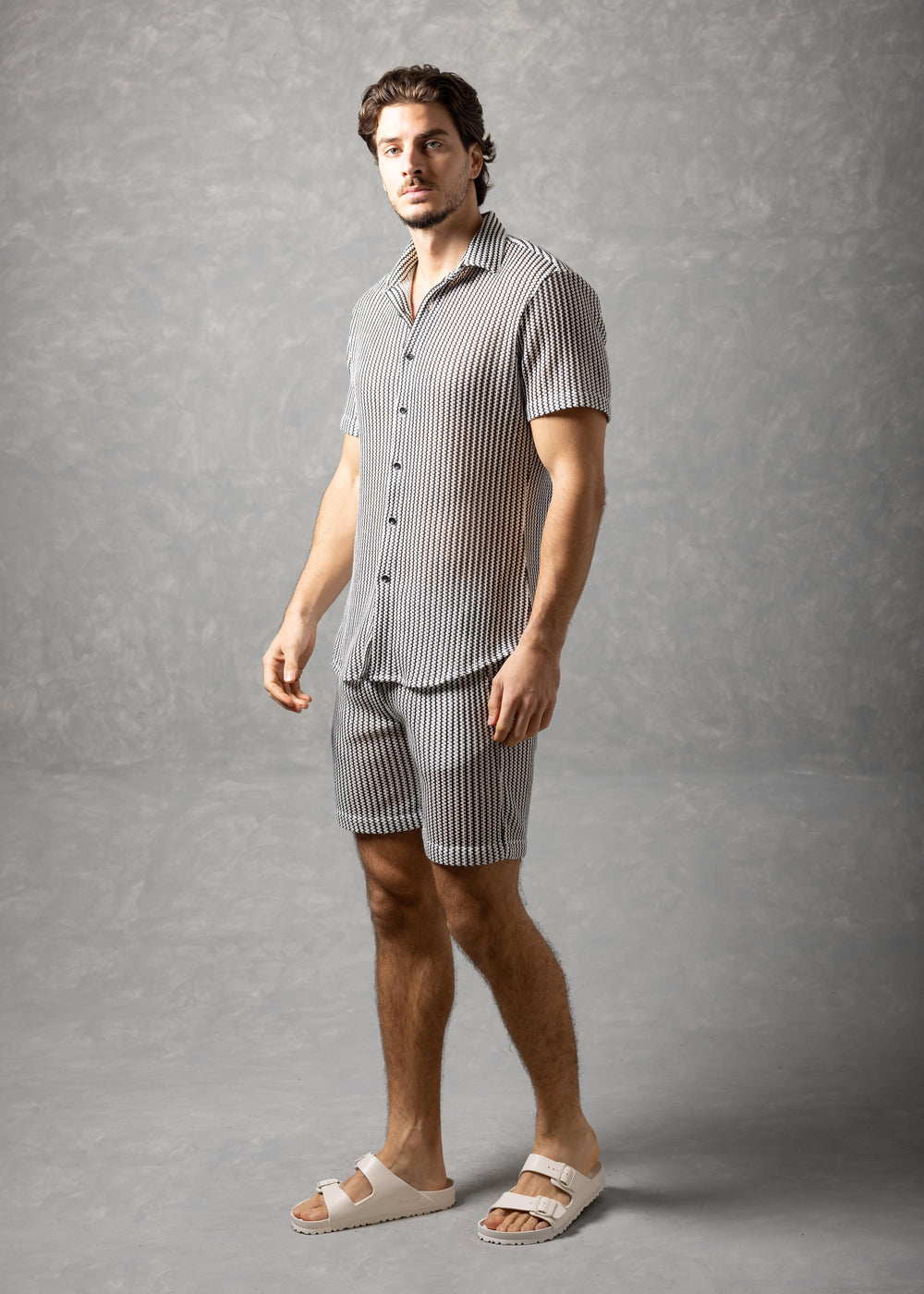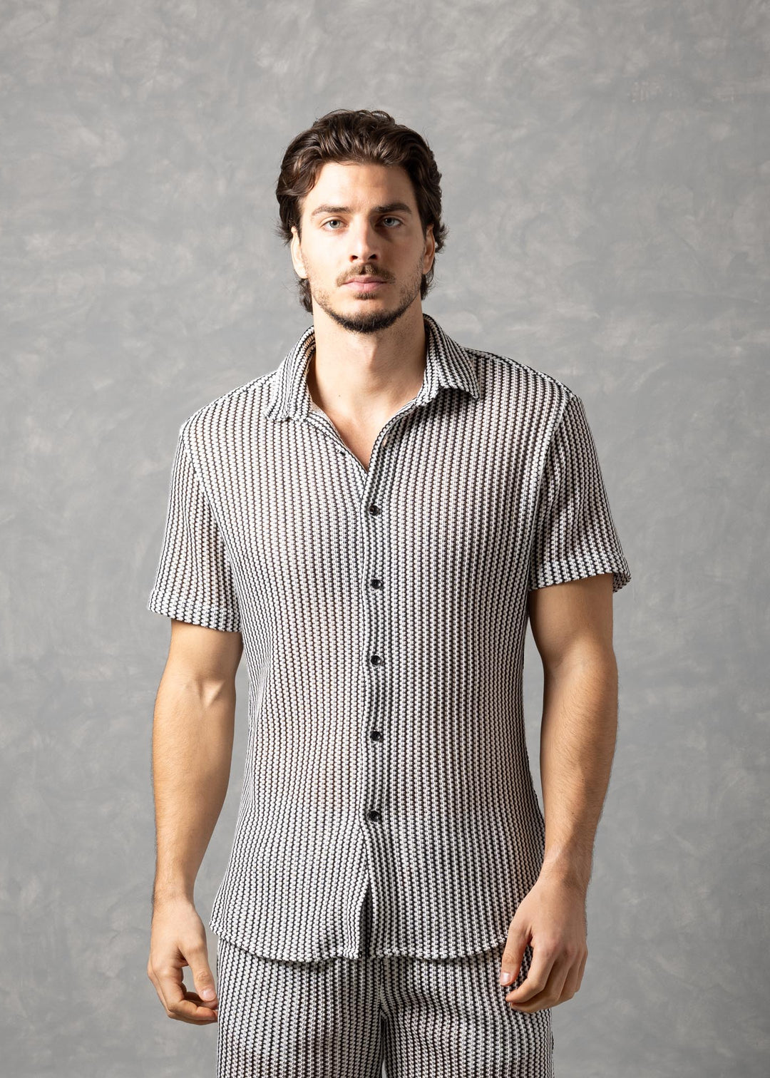 Sahara Geo – Textured Geometric Knit Short Sleeve Button-Up