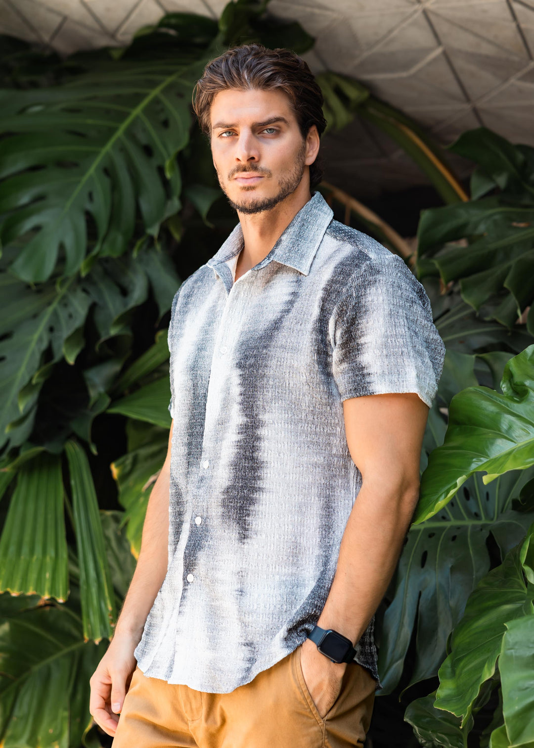 Jet Setting Shirt – Island Print Popcorn Textured Short Sleeve Button-Up