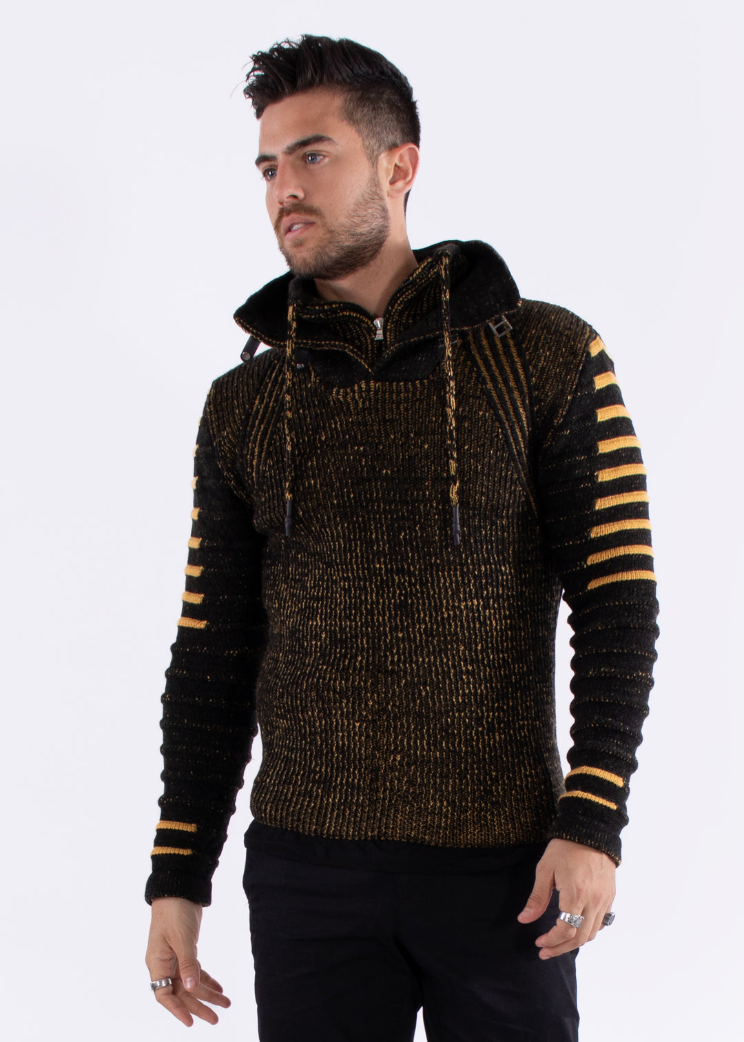 Ribbed Knit Pullover Fur Lined Hooded Sweater Black