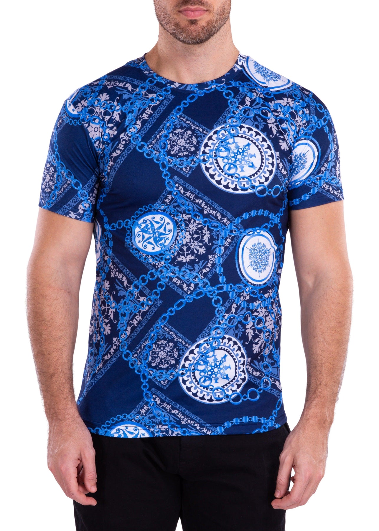Antique Tile Chain Motif Bold Printed All-Over Graphic Tee Navy