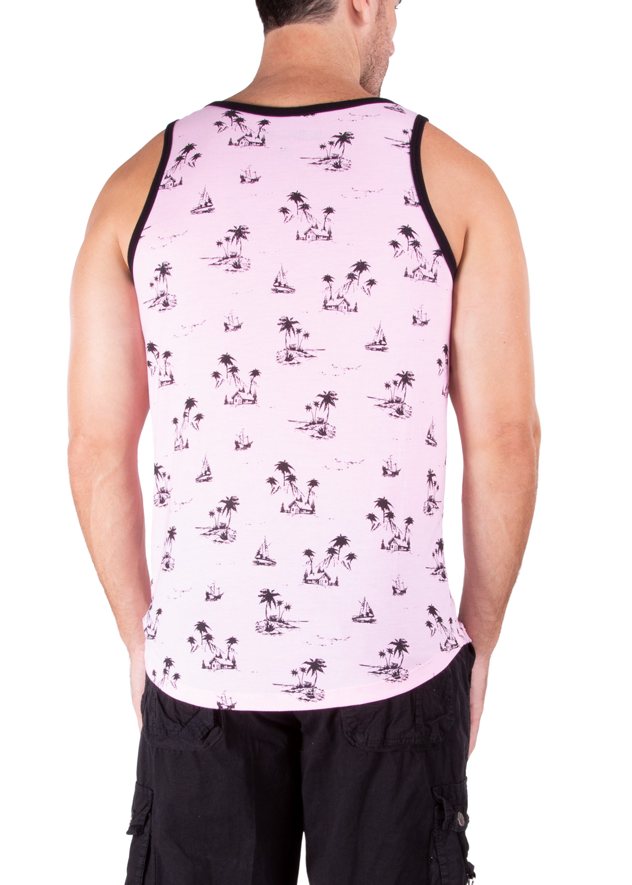 Men's Cotton Printed Tank Top in Pink Featuring Graphics in Black of Palm Trees, Boats, Mountains