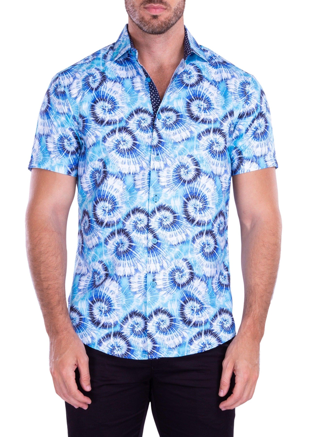 Spiral Tie-Dye Print Short Sleeve Dress Shirt Turquoise