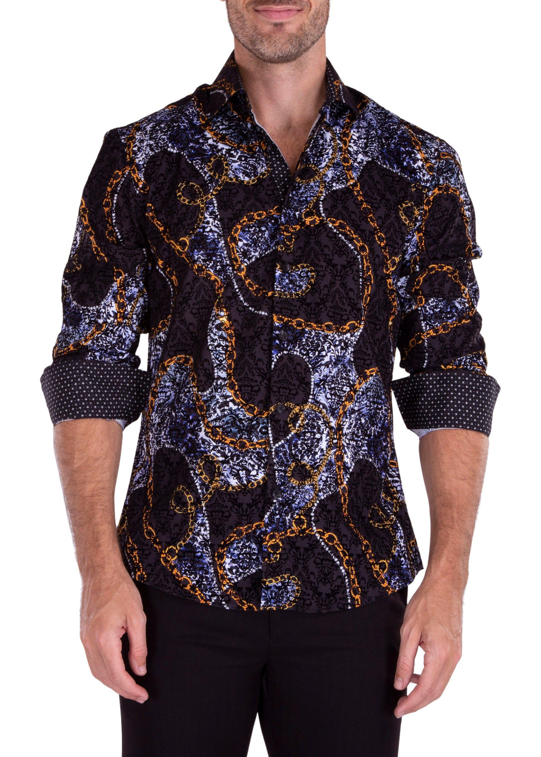 Mixed Print Velvet Texture Long Sleeve Dress Shirt Black