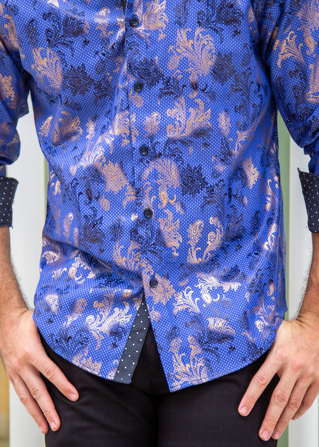 Metallic Flourish Accent On Microprint Long Sleeve Dress Shirt Royal