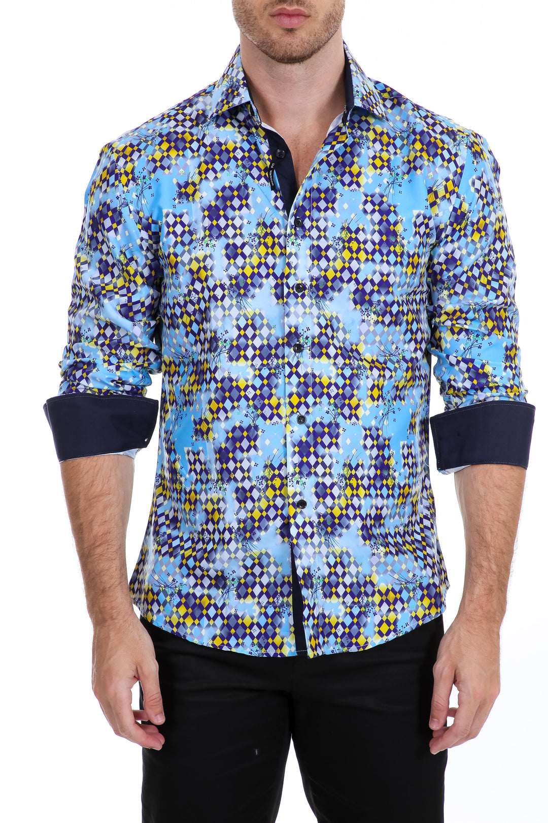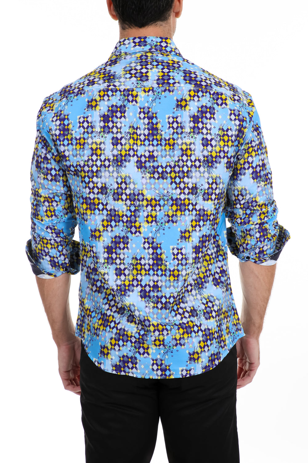 Abstract Geometric Long Sleeve Dress Shirt Yellow & Blue