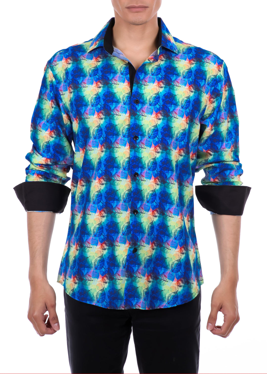 Men's Trippy Leaf Print Long Sleeve Shirt Blue