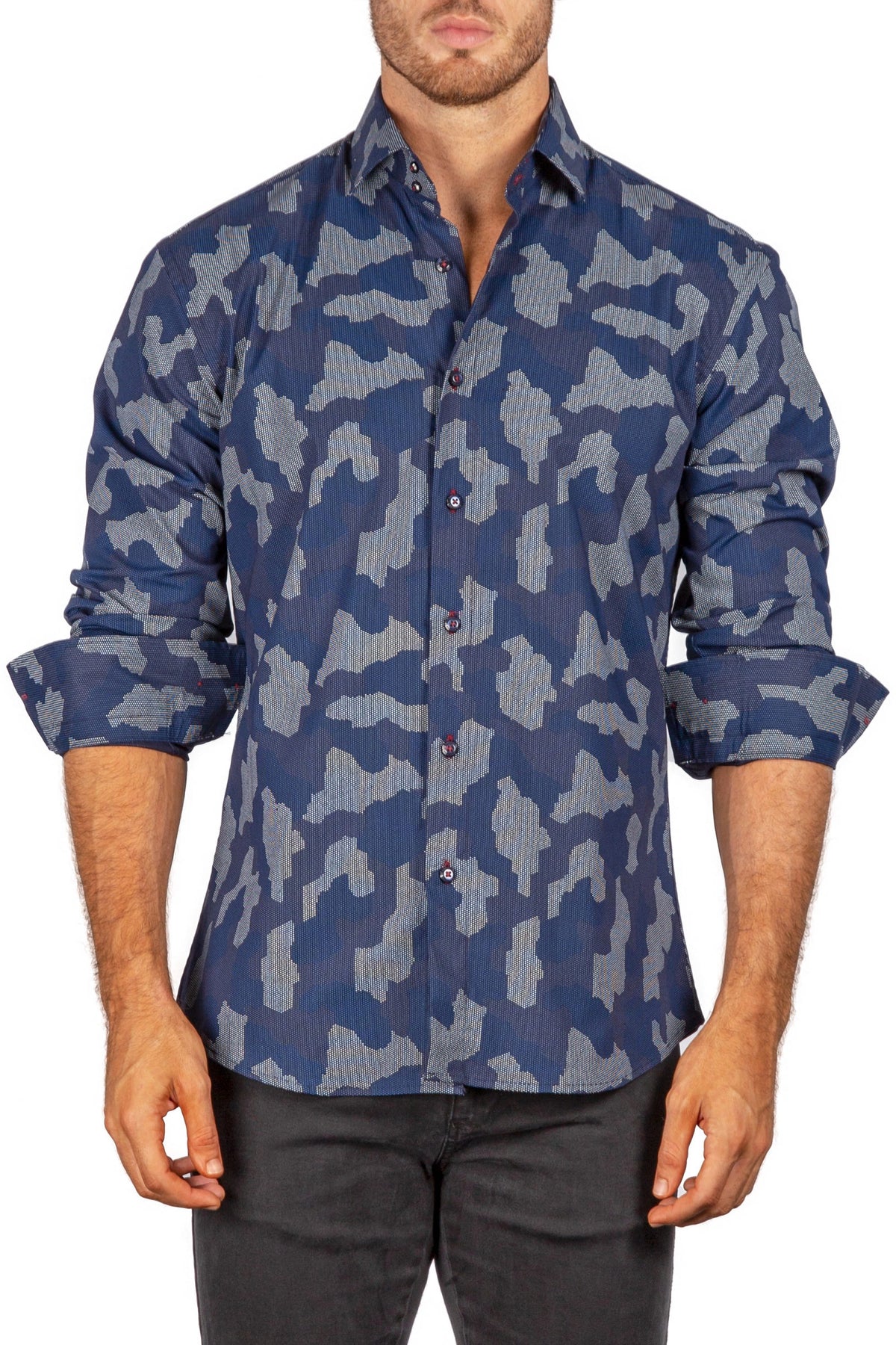 Men's Navy Camo Button Up Long Sleeve Dress Shirt