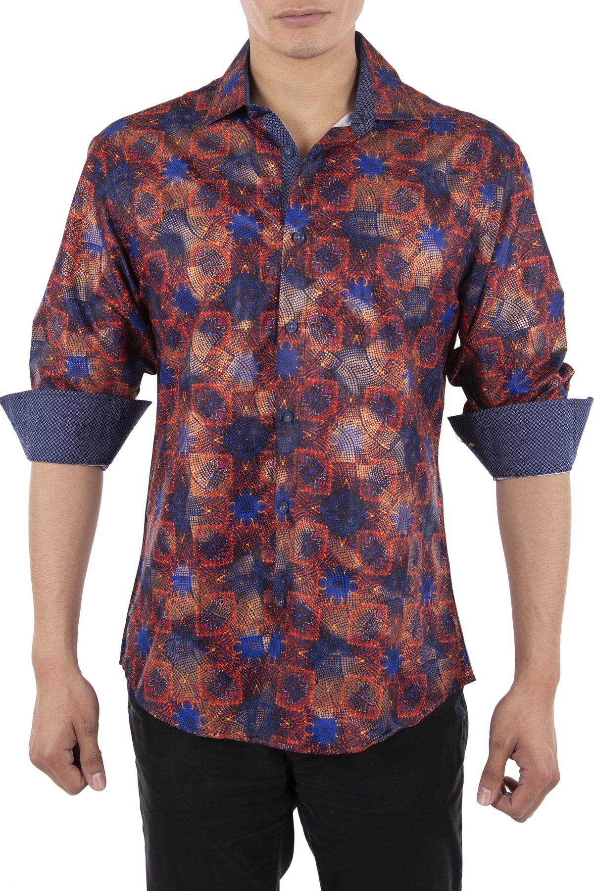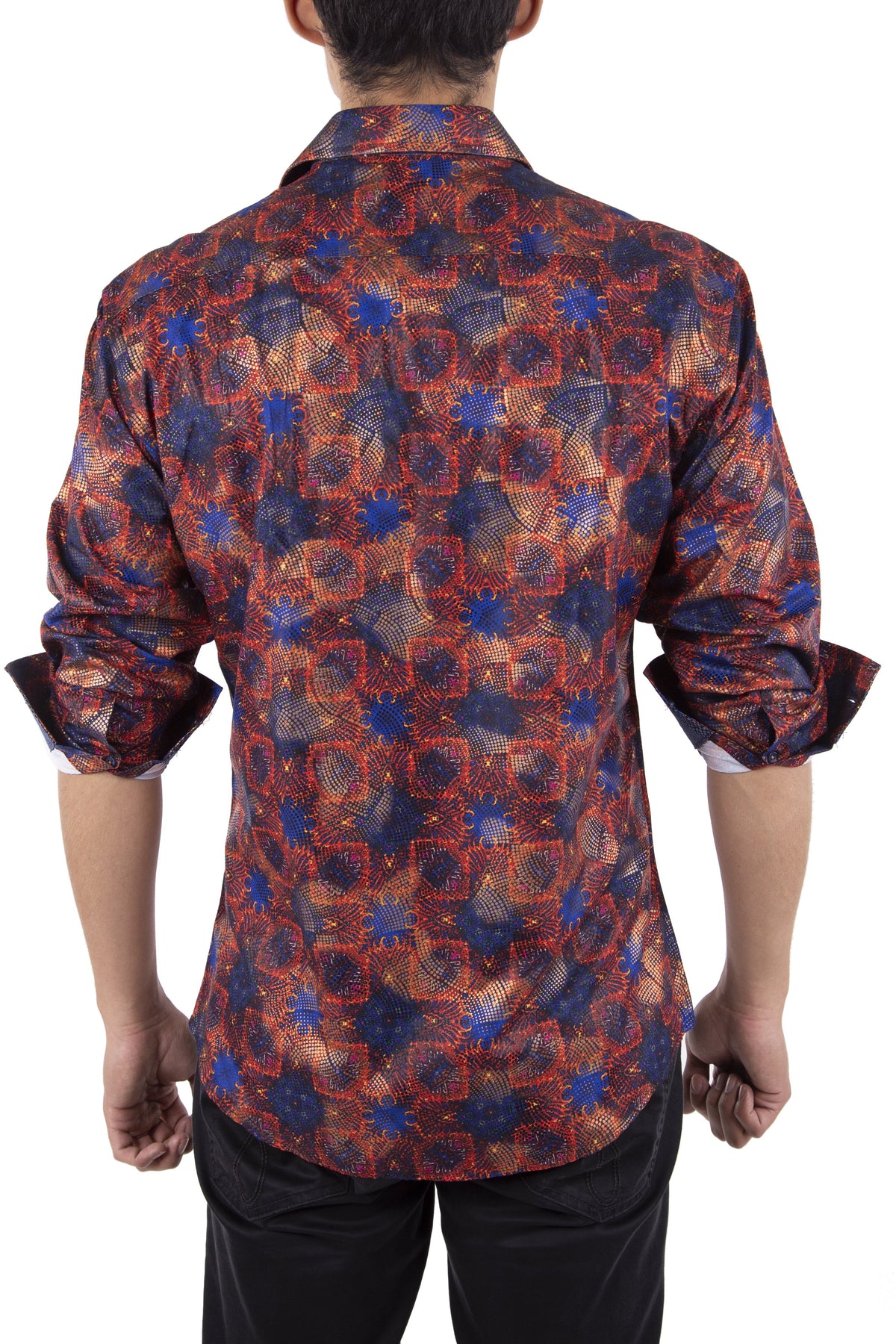 Abstract Checkered Print Red Long Sleeve Dress Shirt