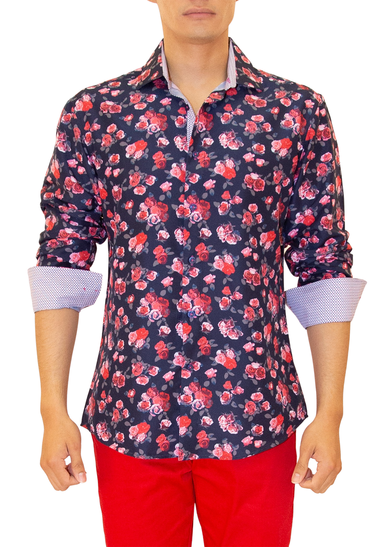 Red Rose Bouquet Print Long Sleeve Dress Shirt Navy