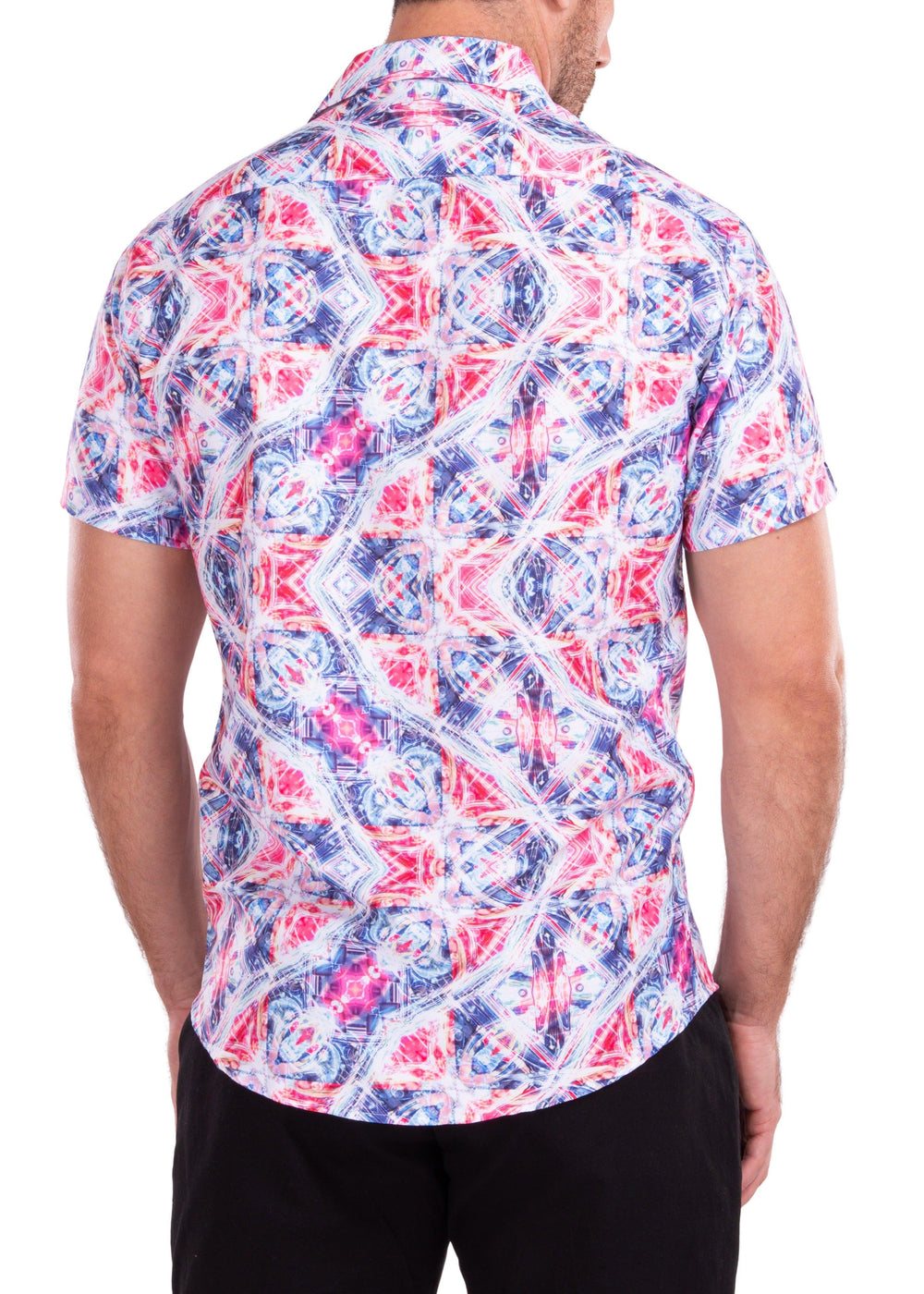 Trippy Kaleidoscope Print White Button Up Short Sleeve Dress Shirt