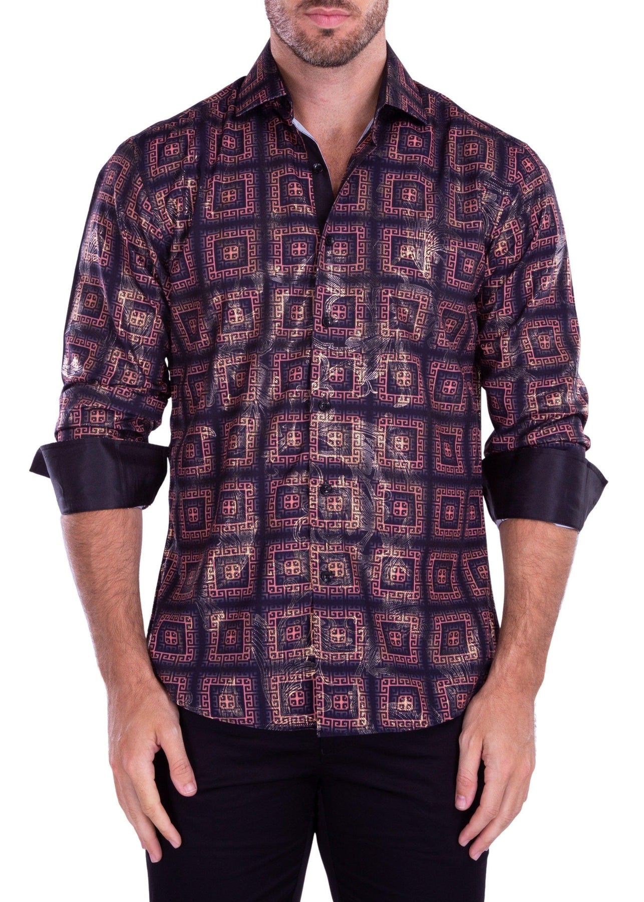 Egyptian Print Metallic Long Sleeve Dress Shirt Black