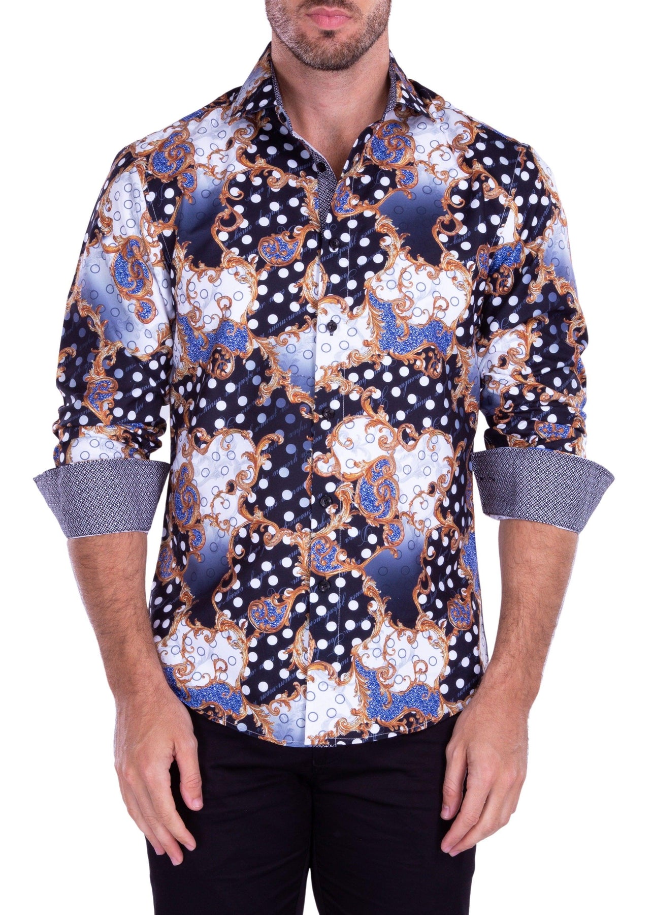 Abstract Baroque Polka Dot Pattern Long Sleeve Dress Shirt Black