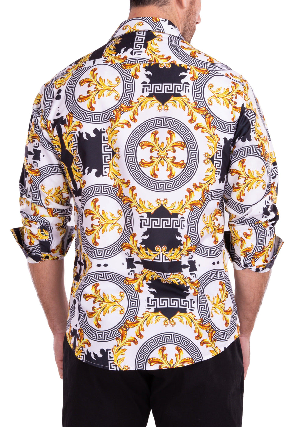 Gold Flourish Geo Contrast Print White Button Up Long Sleeve Dress Shirt