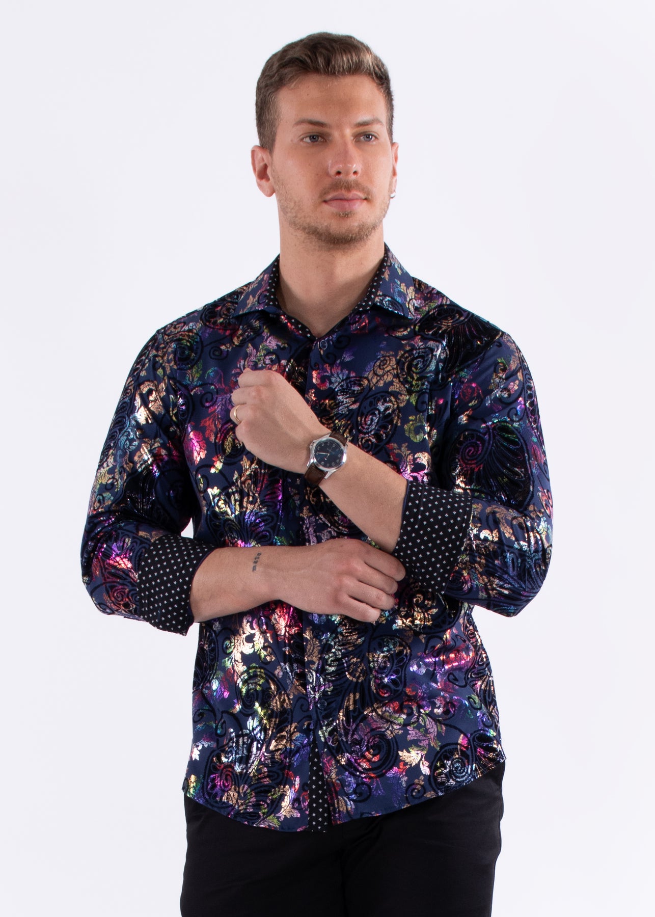 Multicolor Velvet Paisley Long Sleeve Dress Shirt Navy